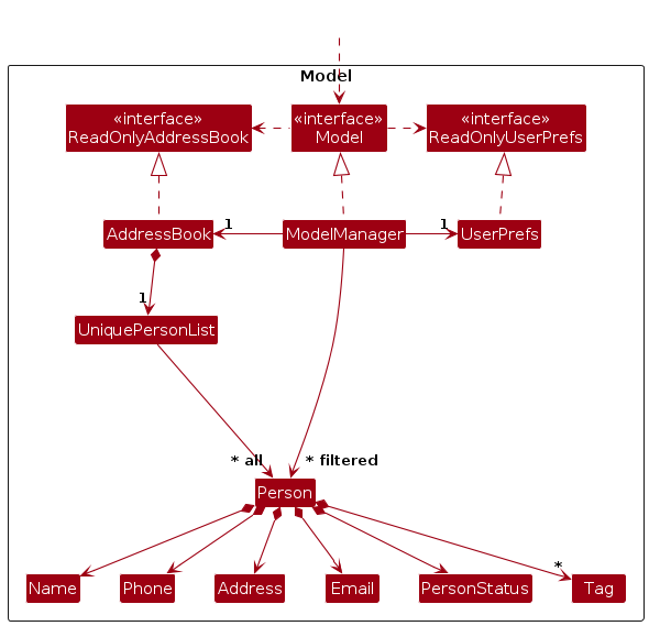 Person objects (which are contained in a UniquePersonList object).Person objects (e.g., results of a search query) as a separate filtered list which is exposed to outsiders as an unmodifiable ObservableList<Person> that can be 'observed' e.g. the UI can be bound to this list so that the UI automatically updates when the data in the list change.UserPref object that represents the user’s preferences. This is exposed to the outside as a ReadOnlyUserPref objects.Model represents data entities of the domain, they should make sense on their own without depending on other components)Note: An alternative (arguably, a more OOP) model is given below. It has a Tag list in the AddressBook, which Person references. This allows AddressBook to only require one Tag object per unique tag, instead of each Person needing their own Tag objects.
